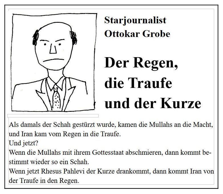 Daß das Mullah-Regime in Iran ins Wanken geriet erfüllt einige Leute hier – zuförderst Exil-Iraner – mit guter Laune. Ein theokratisches Regime, dem man zurecht das Präfix „Terror-“ voransetzt, ist im Begriff, umzustürzen.