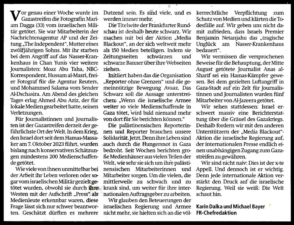 Der Tod von Maryam Abu Daqqa erhielt in der Rezeption des Angriffs vom 25. August 2025 besonders große Aufmerksamkeit. Zahlreiche internationale Medien veröffentlichten Nachrufe und spezifische Artikel über das Leben und Werk von Maryam Abu Daqqa, darunter Nachrichtenagenturen wie Associated Press, und Reuters, britische und US-amerikanische Medien wie The Guardian, The Independent, The New York Times, The Washington Post, israelische Medien wie Haaretz, The Times of Israel und +972 Magazine, arabische Medien wie Al Jazeera, deutschsprachige Medien wie Der Spiegel, Der Freitag und 20min.ch.