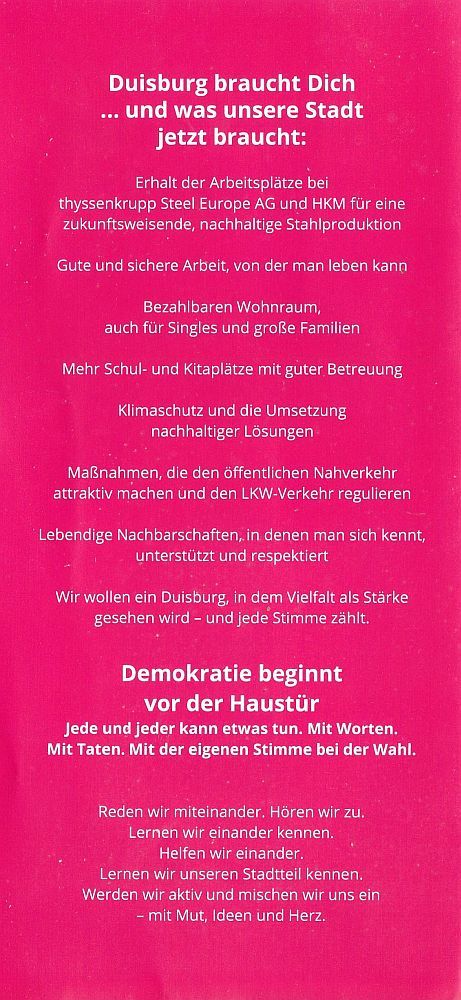 Während Neudorf-Nord und Duissern früher die einzigen Wahlbezirke waren, in denen die CDU von der SPD nicht abgehängt wurden, gingen sie diesmal in Neudorf-Nord nur als Vierte ins Ziel. Erster wurde die SPD (29,3), Zweiter die Grünrn (20,3), Dritter die Linken (14,4) und Vietrter die CDU (12,5). Also für die CDU noch nicht einmal Bronze. AfD Scheiße 10,2.
